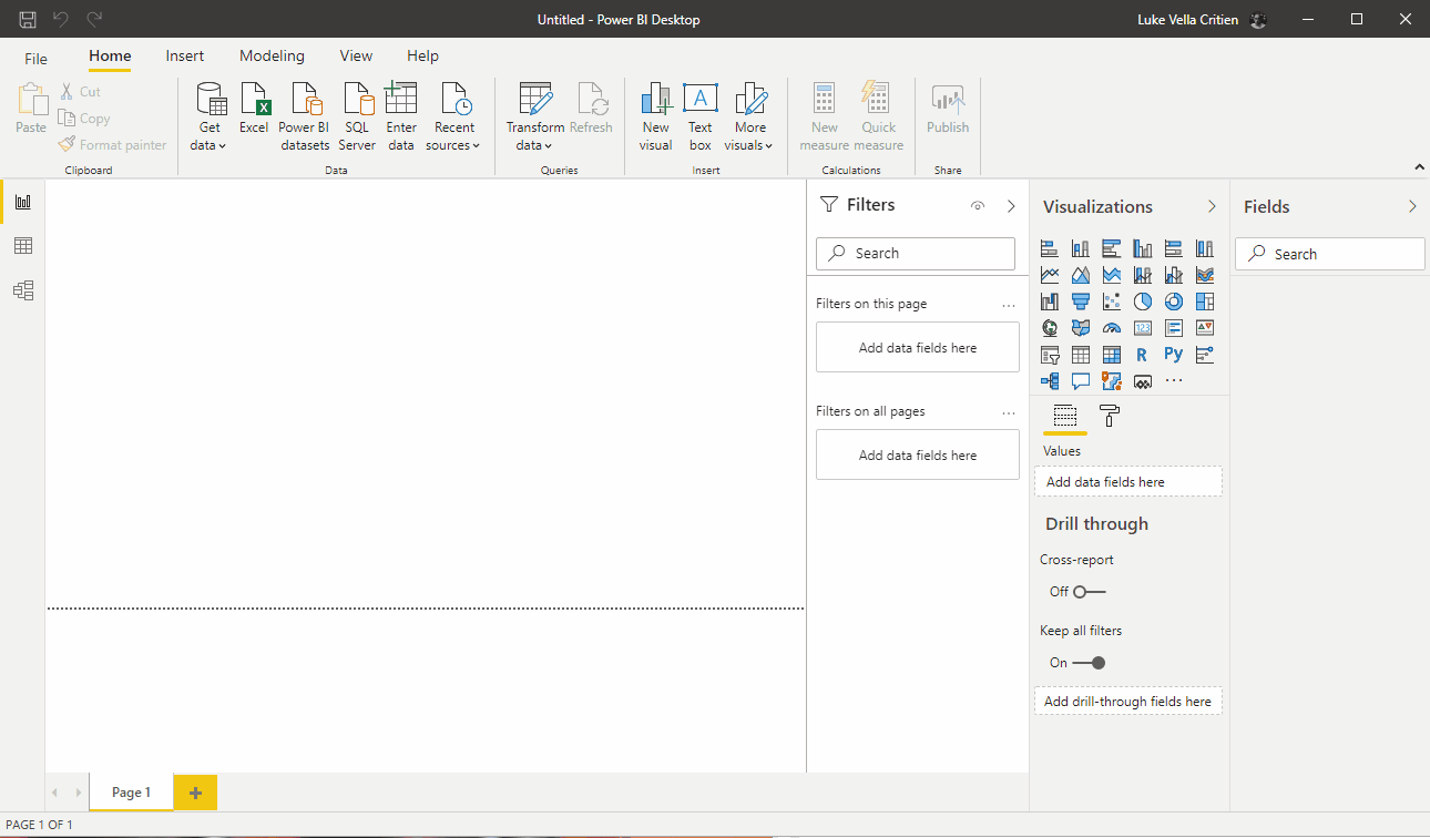 Once that the data is made accessible in Microsoft Power BI, various data visualisation options can be included in the available canvas. In the below screenshot, the major sections within this application have been highlighted in different colors: