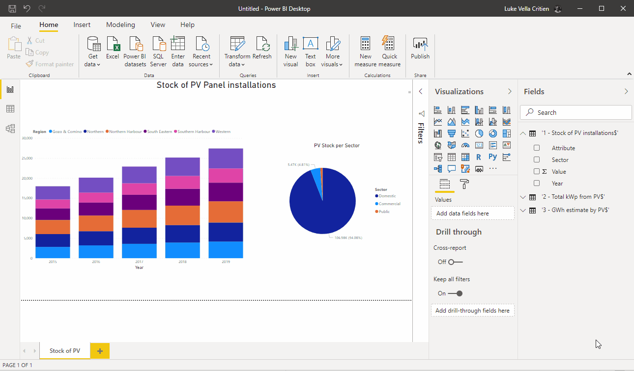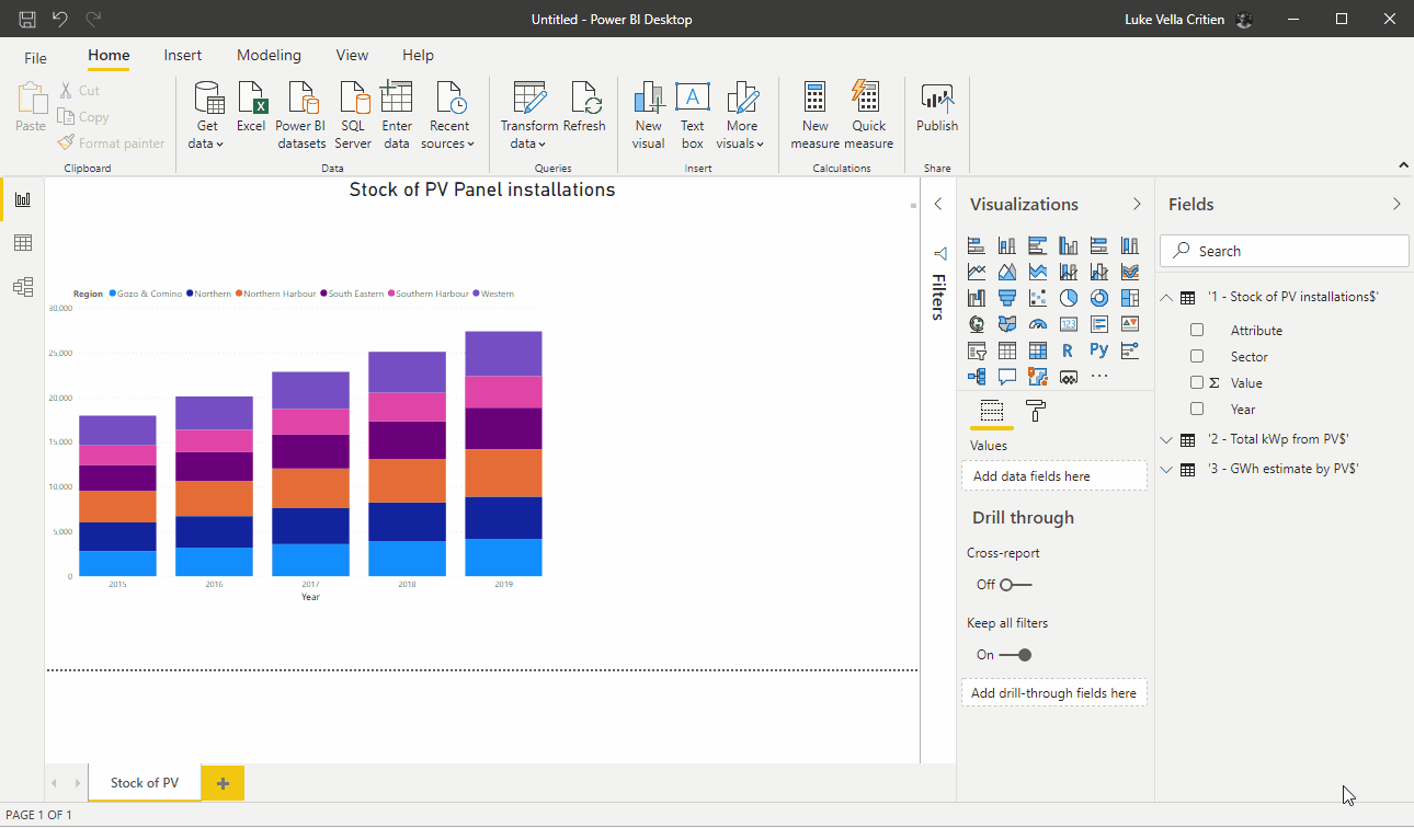 In the first visualisation we will include a stacked-column chart which includes the number of different PV installations for each year and region. Note that 3 columns were dragged from the Fields section to the chart properties and then a number of settings related to the visuals of the chart have been modified.