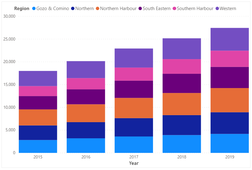 In order to be able to create more meaningful visualisations, we will be performing unpivoting of columns so that we translate the available data into attribute-value pairs. It is important to note that the columns Southern Harbour, Northern Harbour, South Harbour, South Eastern, Western, Northern, Gozo & Comino are no longer columns but have been included in the data rows.
