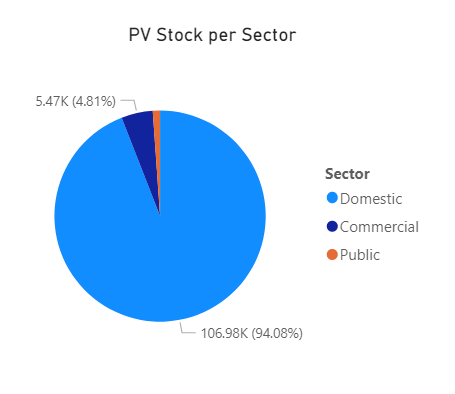 The second visualisation is a Pie Chart which displays the number of PV panel installations per region (Domestic, Commercial and Public)